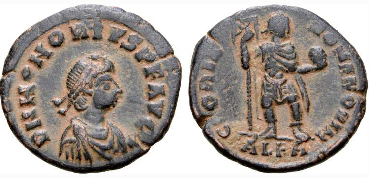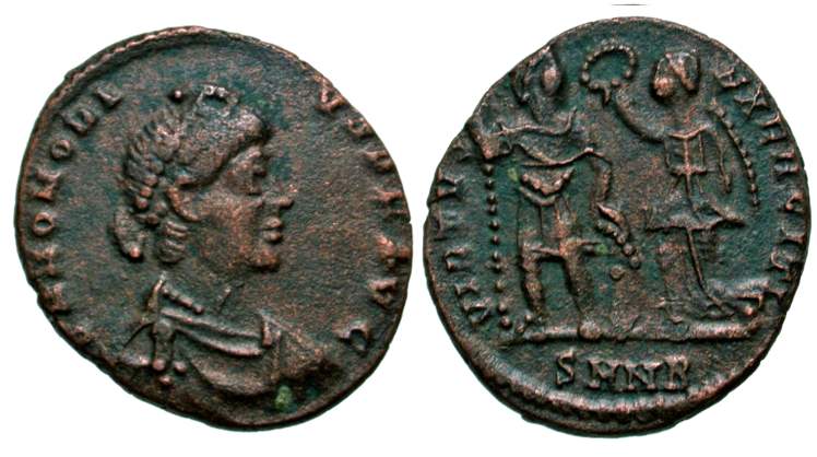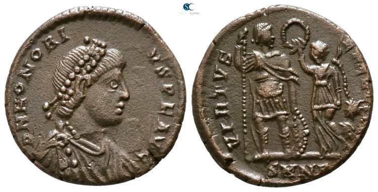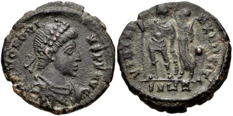 | Nicomedia RIC IX 46c, A | Honorius, AE2 of Nicomedia. AD 393-423. 24 mm. DN HONORIVS PF AVG, pearl diademed, draped, cuirassed bust right. / GLORIA ROMANORVM, emperor standing front, looking right, holding labarum and globe. Mintmark SMNA. Star in right field. RIC IX Nicomedia 46c var (officina); Sear 20987 var (ditto). | Text | ![]() |