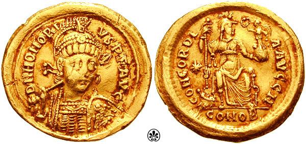 | Thessalonica RIC X 348 | Honorius AV Solidus. Thessalonica, AD 408-420. DN HONORIVS PF AVG, helmeted, cuirassed bust facing, holding spear over right shoulder, shield on left shoulder decorated with standing figure of Victory holding up two wreaths / CONCORDIA AVGG, Constantinople seated front, head right, right foot on prow, holding sceptre and Victory on globe. Star in left field. Mintmark COMOB. DO 785; Sear 20906. | Text | ![]() |