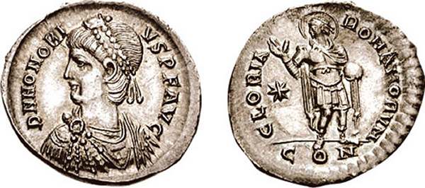 | Constantinople RIC X 61 | Honorius AE3. DN HONORI-VS PF AVG, pearl-diademed, draped and cuirassed bust right / VIRTVS-EXERCITI, emperor standing left, head right, holding spear and resting left hand on shield. Victory, standing beside him crowning him with a wreath. Mintmark: CONSΓ. RIC X 61; Sear 21028. | Text | ![]() |