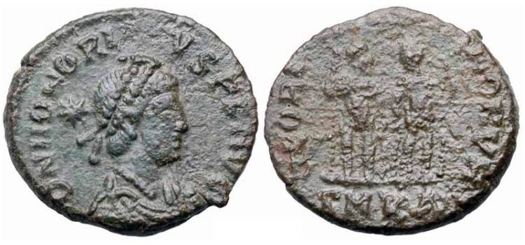 | Thessalonica RIC X 395 | Honorius, Thessalonica, AE4. DN HONORI-VS PF AVG, pearl-diademed, draped cuirassed bust facing right / GLORIA ROMA-NORVM, Two emperors standing facing, heads turned to one another, each holding spear and resting hand on shield. The emperor on the right is smaller than the other. Mintmark TESA. RIC X Thessalonica 395; Sear 21013. | Text | ![]() |