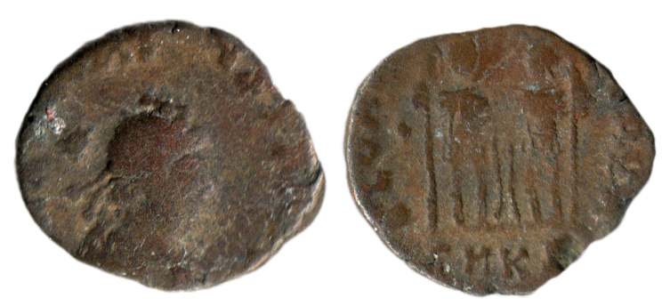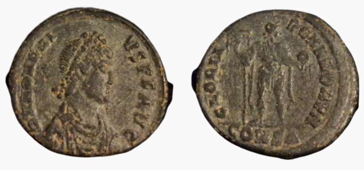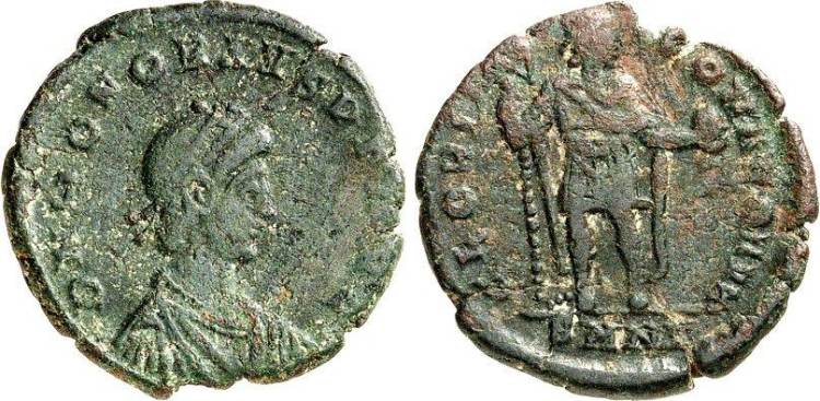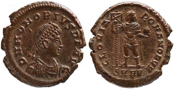 | Constantinople RIC IX 88c, A plant | Honorius, AE2, Constantinople. 392-395 AD. DN HONORIVS PF AVG (no obv. break), pearl-diademed, draped, cuirassed bust right / GLORIA-ROMANORVM, Emperor standing facing, head right, holding standard and globe, sometimes with small branch at foot. Mintmark CONSA. RIC IX Constantinople 88c; Sear 20985. | Text | ![]() |
