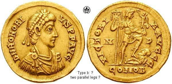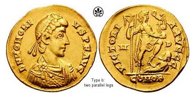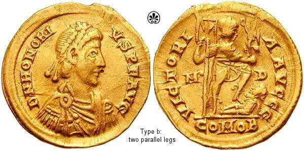 | Ravenna RIC X 1310 | Honorius AV Solidus. Ravenna mint, after death of Arcadius AD 408-423. DN HONORIVS P F AVG, helmeted, pearl-diademed, draped and cuirassed bust right / VICTORIA AVGGG, emperor standing facing, holding long Tau-Rho, left hand on hilt of sword, he is crowned by the Hand of God and places right foot on prostrate serpent-tailed lion, R-V across field. Mintmark COB. DOC 742; Sear 20923. | Text | ![]() |