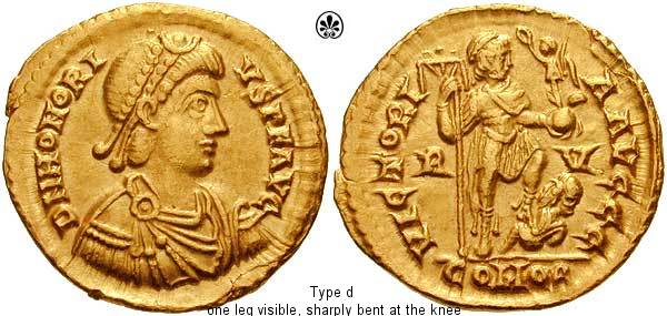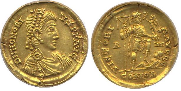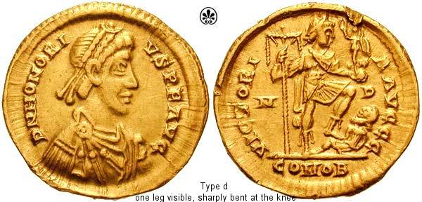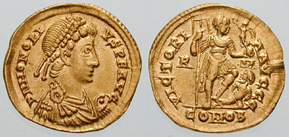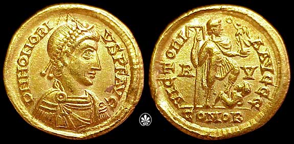 | Ravenna RIC X 1328 | Honorius AV Solidus. Pearl-diademed, draped and cuirassed bust right / Honorius standing right, holding standard and Victory on globe, spurning captive seated left. R-V across fields. Mintmark COMOB. DOCLR 735; Sear 20920. | Text | ![]() |