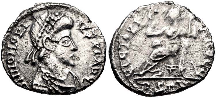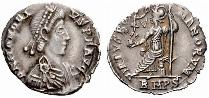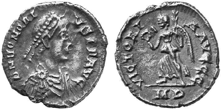 | RIC X 1221 | Honorius, AR Light Miliarensis, Milan. AD 395-423. DN HONORI-VS PF AVG, pearl diademed, draped, cuirassed bust right. / VIRTVS EXERCITVM, Emperor standing front, looking left, holding spear in right hand and resting left hand on shield. Mintmark MDPS. RIC X 1221; Sear 20958; RSC 56A; South Ferriby Hoard 4 (this coin). | Text | ![]() |