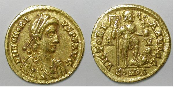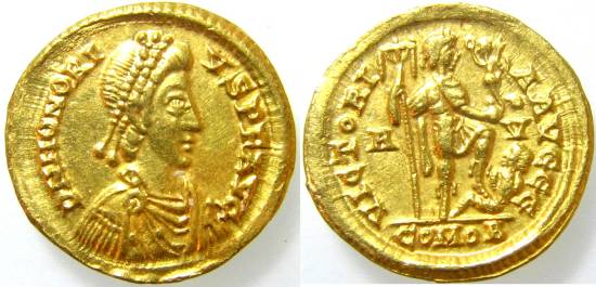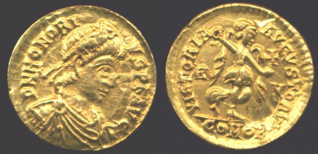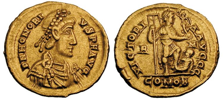 | Ravenna RIC X 1319 | Honorius AV Solidus. Struck 402-423 AD. D N HONORI-VS P F AVG, diademed, draped and cuirassed bust right / VICTORI-A AVGGG, Honorius standing right with left foot on captive, holding standard and Victory. R-V across fields. Mintmark COMOB. RIC X 1319; Sear 20920. | Text | ![]() |