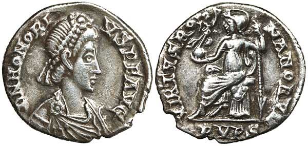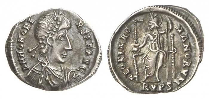 | Milan RIC X 1228 | Honorius AR Siliqua. Milan mint. DN HONORIVS PF AVG, diademed draped bust right / VIRTVS ROMANORVM, Roma seated left holding Victory and inverted spear, Mintmark MDPS. | Text | ![]() |