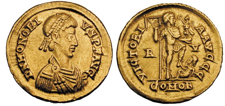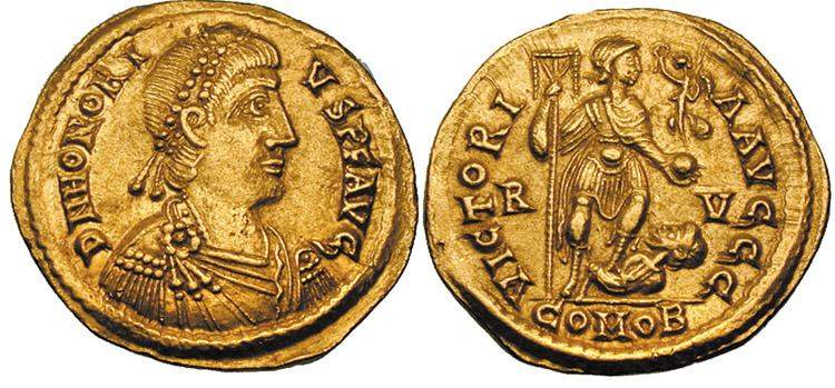 | Rome RIC X 1352 | Honorius AV Solidus. Struck 404-416 AD, Rome mint. D N HONORI-VS P F AVG, pearl-diademed, draped and cuirassed bust right / VICTORI-A AVGGG, Honorius standing right, holding standard and Victory on globe, spurning captive seated left; R-M across fields. Mintmark COMOB. RIC X 1352; Sear -. | Text | ![]() |