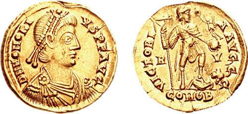 | Thessalonica RIC X 359 | Honorius AV Solidus. DN HONORIVS PF AVG, three-quarter facing bust of Honorius, helmeted, cuirassed, holding spear over shoulder and a shield with a horseman on it / CONCORDIA AVGG, Constantinoplis seated facing, looking right, holding Victory on globe and sceptre, right foot on prow. Mintmark TES dot OB. RIC X 259; Sear 20907. | Text | ![]() |