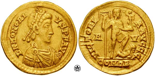| Sirmium RIC IX 15d | Honorius AV Solidus. Sirmium, spring AD 393–17 January 395. D N HONORIS P F AVG, pearl-diademed, draped and cuirassed bust right / VICTORI—A AVGGG A, emperor standing right in military attire, holding standard and Victory on globe, right foot treading on captive, S—M across fields, mintmark COMOB. DO 693¨; RIC IX 15d; Sear 20915. | Text | ![]() |