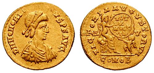 | Thessalonica RIC X 38 | Honorius AV Solidus. Struck 397-402 AD, Thessalonica mint. D N HONORI-VS P F AVG, diademed, helmeted and cuirassed three-quarter facing bust, holding spear over shoulder and shield decorated with horseman spearing a fallen enemy; christogram on breast / CONCORDI-A AVGG, Constantinopolis seated facing, head right, holding sceptre and Victory on a globe, prow to left. Mintmark COMOB. RIC X 38; Sear 20900. | Text | ![]() |
