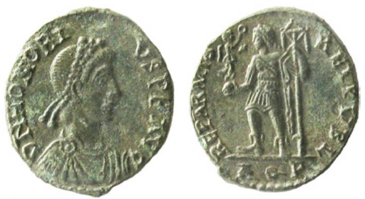 | Antioch RIC IX 68e | Honorius AE2 of Antioch. AD 393-395. DN HONORIVS PF AVG, pearl-diademed, draped and cuirassed bust right / GLORIA ROMANORVM, emperor standing, head right, holding labarum and globe. Mintmark ANTΓ. RIC IX Antioch 68e; Sear 20989. | Text | ![]() |