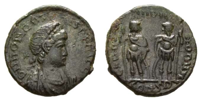 | Constantinople RIC X 109 | Honorius, AE4 of Constantinople. 0.82 gr, 11-12 mm. DN HONORIVS PF AVG, pearl-diademed, draped, cuirassed bust right / CONCOR-DIA AVG, Cross. Mintmark CONSA. RIC X 109; Sear 21033. | Text | ![]() |
