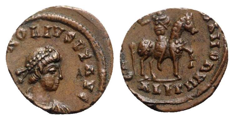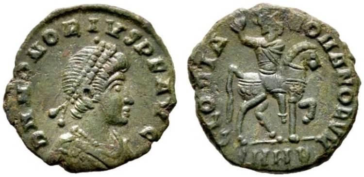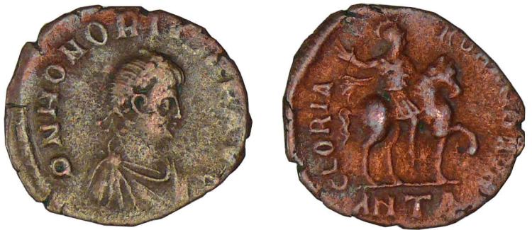 | Antioch RIC IX 69e, A | Honorius, AE3, Antioch. AD 392-395. DN HONORIVS PF AVG, pearl diademed, draped, cuirassed bust right / GLORIA-ROMANORVM, emperor on horseback riding right, raising right hand. Mintmark ANTA. RIC IX Antioch 69e; Sear 20999. | Text | ![]() |