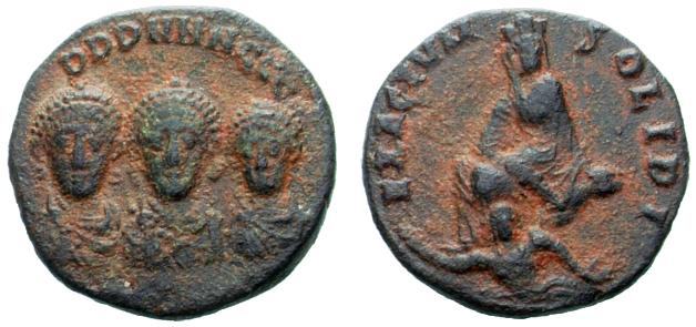 | Antioch NAC 29, 663 | Honorius, Arcadius und Theodosius II, AE 18mm Exagium. Antioch, c. 403-408 AD. DDD NNN GGG, Three diademed busts facing, the largest in the middle, the smallest to right / EXAGIVM SOLIDI, Tyche of Antioch seated on rocks, head facing, river-god Orontes beneath. NAC Auction 29, lot 663, unpublished. | Text | ![]() |