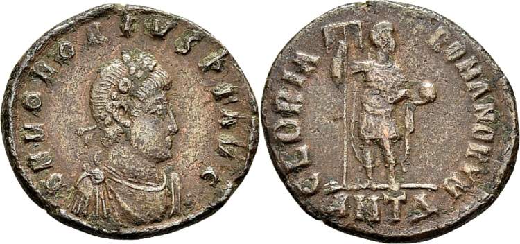 | Antioch RIC X 72, Γ | Honorius AE3. DN HONORI-VS PF AVG, pearl-diademed, draped and cuirassed bust right / VIRTVS-EXERCITI, emperor standing left, head right, holding spear and resting left hand on shield. Victory, standing beside him crowns him with a wreath which she holds in her right hand. Mintmark ANTΓ. RIC X 72; Sear 21031. | Text | ![]() |