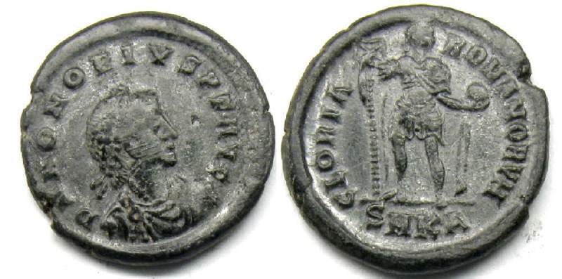 | Alexandria RIC X 76 | Honorius, AE4 of Alexandria, AD 395-401. DN HONORI-VS PF AVG, pearl-diademed, draped, cuirassed bust right / VIRTVS-EXERCITI, emperor standing left, head right, holding spear and resting left hand on shield, crowned by Victory, standing left at his side. Mintmark ALEB. RIC X 76; Sear 21032. | Text | ![]() |