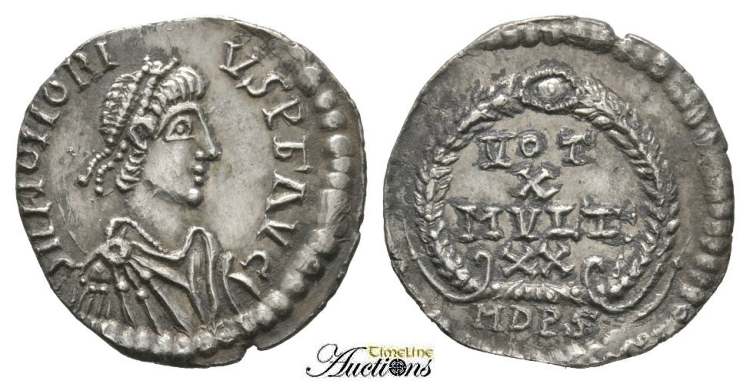 | Milan RIC X 1226 | Honorius. AR siliqua. Milan mint, AD 388-394. DN HONORI-VS PF AVG, pearl-diademed, draped, cuirassed bust right / VOT V MVLT X legend in four lines within wreath with wreath ties type 6. Mintmark MDPS. RIC X 1226; RSC 63; Sear 20972. | Text | ![]() |