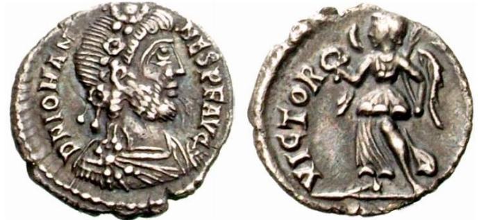 RIC 1904 | Johannes. AV Tremissis, Ravenna mint. AD 423-425. DN IOHANNES PF AVG, pearl- and rosette-diademed, draped and cuirassed bust right / VICTORIA AVGVSTORVM, Victory walking right, holding wreath and cross on globe. R-V across fields. Mintmark COMOB. RIC 1904, Depeyrot 12/3; Cohen 6; Sear 21118. | Text |  |