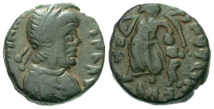 RIC 1920-1923 | Johannes, 423-425 AD. Rome, AE11mm; 0.7g. DN IOHANNES PF AVG, pearl diademed, draped, cuirassed bust right / SALVS REI-PVBLICAE, Victory walking left, trophy over shoulder, dragging captive behind her. Chi-rho over P in left field. Mintmark off flan. RIC X 1920 or 1923, depending on the mintmark PRM or RMP; Sear 21122. | Text |  |