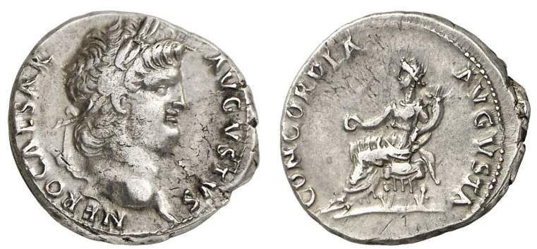 | RIC 49 Sear 1942 | Nero, AR denarius. AD 64-65. Rome Mint. NERO CAESAR AVGVSTVS, Laureate head right / CONCORDIA AVGVSTA, Concordia seated left, holding patera and cornucopiae. RIC I 49; RSC 67; BMCRE 63; Sear 1942. | Text | Image | |