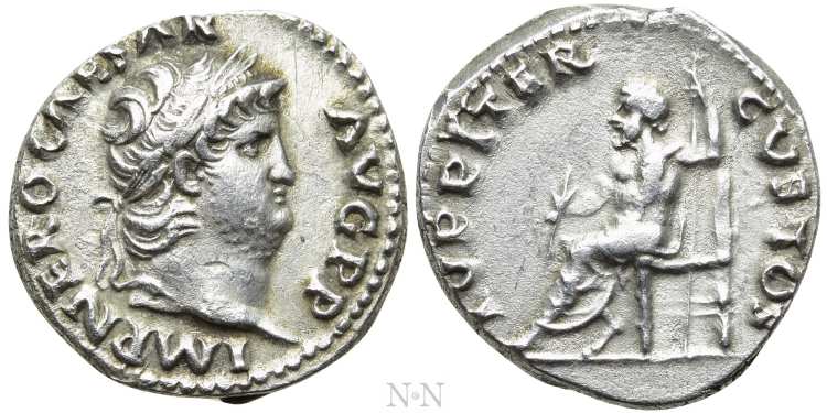 | RIC 69 Sear 1943 | Nero AR denarius. IMP NERO CAESAR AVG PP, laureate head right / IVPPITER CVSTOS Jupiter seated left, bare to the waist, holding thunderbolt and sceptre. RIC 69; RSC 123; BMCRE 80; MacDowall 65; Paris 239. | Text | Image | |