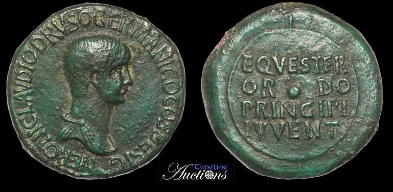 | RIC 108[claudius] Sear 1920 | Nero, as Caesar, AE Sestertius. Thrace, 51 AD. NERONI CLAVDIO DRVSO GERMANICO COS DESIGN, bare head right / EQVESTER OR DO PRINCIPI IVVENT in four lines on a round shield attached to vertical spear behind. RIC 108 [Claudius]; Cohen 99; Sear 1920. | Text | Image | |