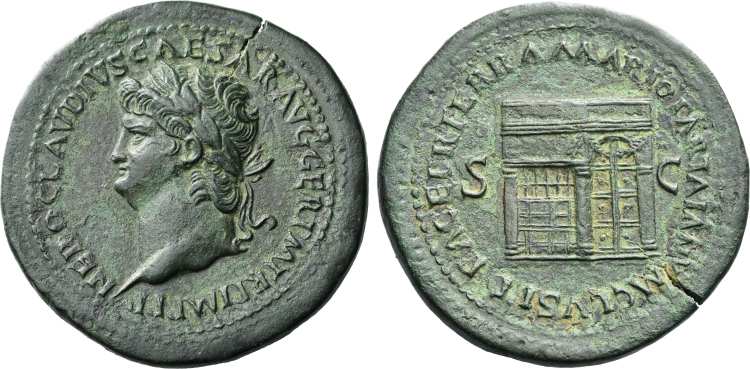 | RIC 110 corr | Nero, AE dupondius, Rome. AD 63. NERO CLAVD CAESAR AVG GERM PM TR P IMP PP, radiate head right / No legend, frontal view of the Macellum Magnum, its domed central section (in two storeys and approached by steps) flanked by two-storied wings of unequal height, with porticos, above the steps in centre, a male figure, standing left, holding long sceptre in left hand. RIC 110 corr. (this coin); WCN 180; BMC 196. | Text | Image | |