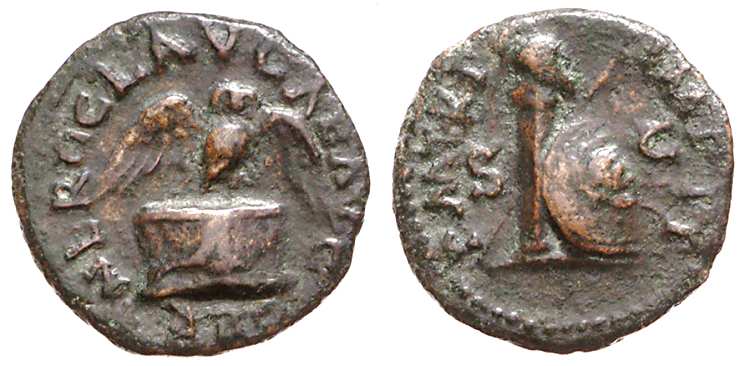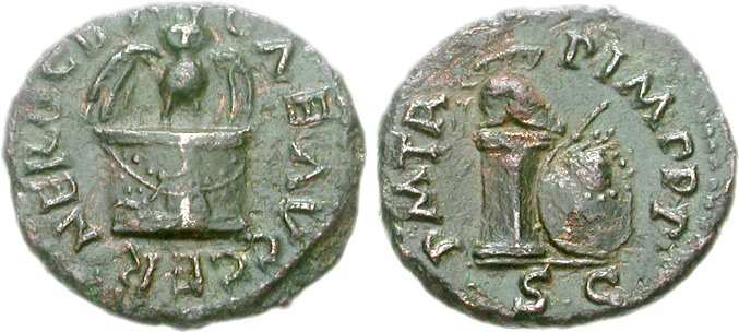 | RIC 126 | Nero. AE Quadrans. Rome. AD 63. NERO CLA CAE AVG GERM, Helmet right on column, round shield leaning against the column and a transverse spear behind the column. / PM TR P IMP PP, Upright olive branch. RIC I 126; BMC 292; WCN MacDowell 340. | Text | Image | |