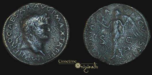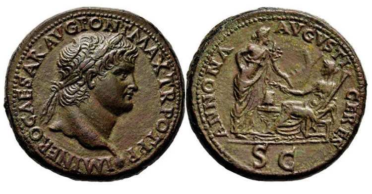 | RIC 137 | Nero AE Sestertius. NERO CLAVD CAESAR AVG GER P M TR P IMP P P, laureate head right, aegis on bust/ ANNONA AVGVSTI CERES, SC in exergue, Ceres seated left with grain-ears and torch, facing Annona standing right with cornucopiae; between them, ship's stern and modius set on altar. | Text | Image | |