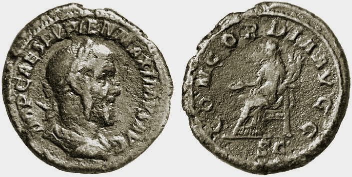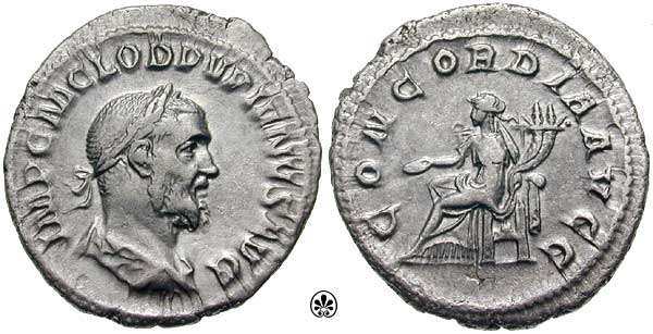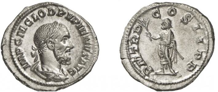 | RIC 1 Sear 8523 | Pupienus AR Denarius. IMP C M CLOD PVPIENVS AVG, laureate, draped and cuirassed bust right / CONCORDIA AVGG, Concordia seated left with patera and double cornucopiae. RIC 1, RSC 6. | Text | Image | |