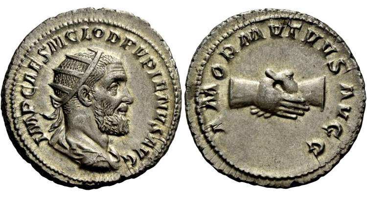 | RIC 10a Sear 8519 | Pupienus AR Antoninanus. IMP CAES M CLOD PVPIENVS AVG, radiate, draped and cuirassed bust right / CARITAS MVTVA AVGG, clasped hands. RIC 10a, RSC 4. | Text | Image | |