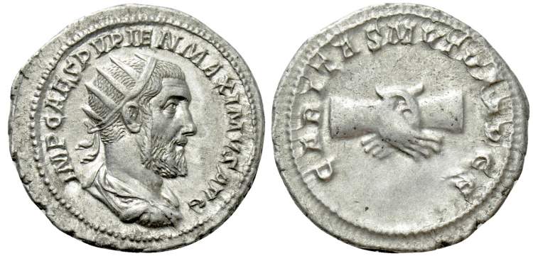 | RIC 11b Sear 8522 | Pupienus AR Antoninianus. IMP CAES M PVPIEN MAXIMVS AVG, radiate, draped and cuirassed bust right / PATRES SENATVS, clasped right hands. RSC 21. | Text | Image | |