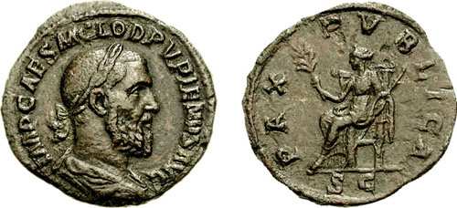 | RIC 22b Sear 8534 | Pupienus AE Sestertius. IMP CAES PVPIEN MAXIMVS AVG, laureate bust right / PAX PVBLICA S-C, Pax seated left with branch and sceptre. RIC 22, Cohen 23. | Text | Image | |