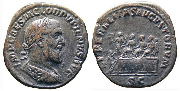 | RIC 13 | Pupienus, AE sestertius, Rome. AD 238. 18.95 g. IMP CAES M CLOD PVPIENVS AVG, laureate, draped and cuirassed bust right. / LIBERALITAS AVGVSTORVM, Balbinus, Pupienus and Gordian III all seated left on platform; behind them, soldier standing left, holding spear; Liberalitas standing left before them, holding abacus and cornucopia, citizen, mounting the steps. SC below. RIC 13; Cohen 18. | Text | Image | |