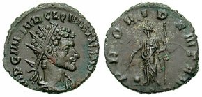 | RIC 78, Q var | Quintillus, AE antoninianus. Siscia mint. IMP CM AVR CL QVINTILLVS AVG, radiate head right / VBERITAS AVG, Uberitas standing left, holding purse and cornucopiae. Q in right field. RIC V-1 Siscia 78 var (bust type). | Text | Image |