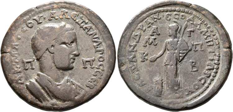 | Themisonium Toumpan 484 | Severus Alexander, AE38 of Themisonium, Phrygia. AD 222-235. 23.75 g. AY K M AY CEY AΛEXANΔΡOC, laureate, draped and cuirassed bust right. / ΘEMICΩNEΩN, Tyche standing left, holding rudder with poppies, and cornucopiae. Toumpan Zeugma finds 484; Vienna GR 34029; Biga 11, 239. | Text | ![]() |