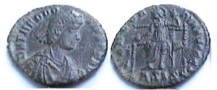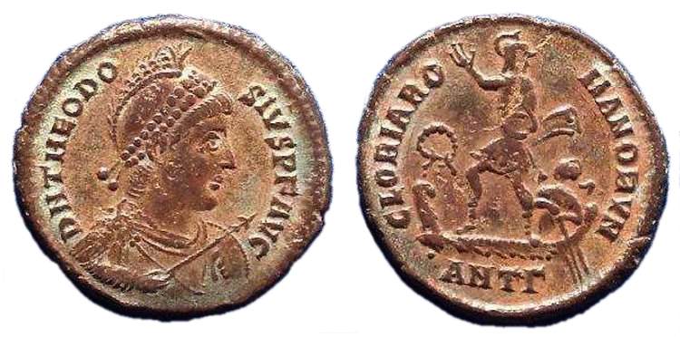 | Antioch RIC 68a | Theodosius I AE2. 392-395 AD. DN THEODOSIVS PF AVG, pearl-diademed, draped and cuirassed bust right / GLORIA ROMANORVM, emperor standing facing holding labarum and globe. Mintmark ANTA. | Text | Image |