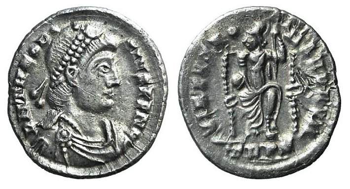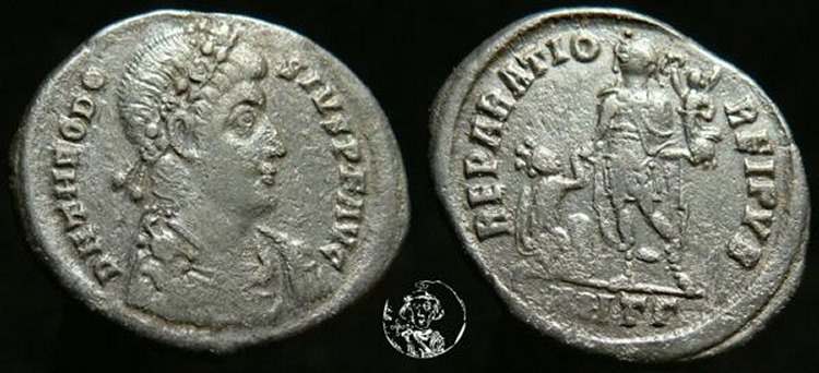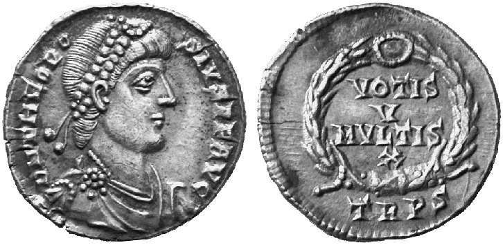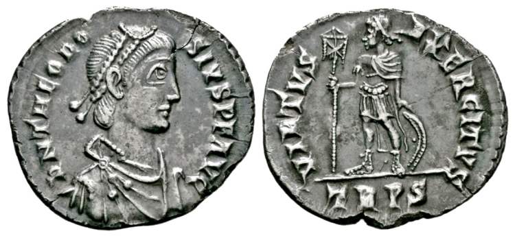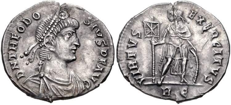 | Trier RIC IX 93b | Theodosius I, AR Light Miliarensis, Trier. 4.4 g. AD 388-392. DN THEODO-SIVS PF AVG, pearl-diademed, draped and cuirassed bust right. / VIRTVS EXERCITVS, Emperor standing left, holding standard and resting left hand on shield. Mintmark TRPS. RIC IX Trier 93b; RSC 55a; Sear 20441; Thruxton Hoard 4 (this coin). | Text | Image |