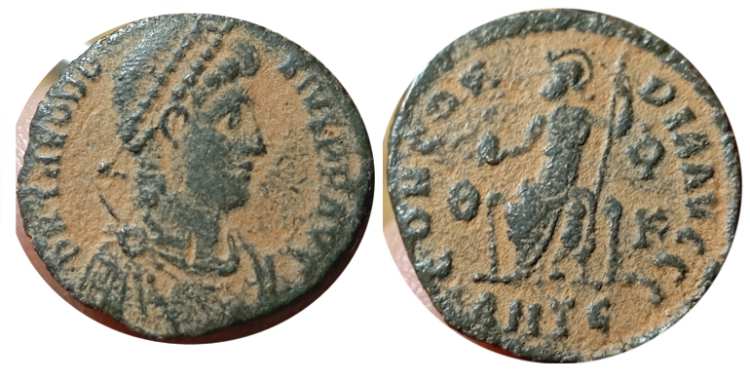 | Antioch RIC 63c_var | Theodosius I, AE2, Antioch Mint, 383-388 AD. DN THEODO-SIVS PF AVG, pearl-diademed, draped and cuirassed bust right / VIRTVS EXERCITI, Emperor standing right holding globe and labarum, foot on captive right. Mintmark ANTΔ. RIC IX Antioch 63c but unpublished for officina Δ. | Text | Image |