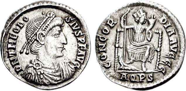 | Aquileia RIC IX 25 | Theodosius I AR Siliqua of Antioch. AD 379-395. DN THEODOSIVS PF AVG, pearl-diademed, draped and cuirassed bust right. / CONCORDIA AVGGG, Concordia, turreted, seated facing on throne, looking right, right foot on prow, holding sceptre and cornucopiae. Mintmark AQPS. RIC IX Aquileia 25; RSC 4c; Sear 20448. | Text | Image |