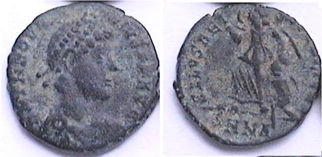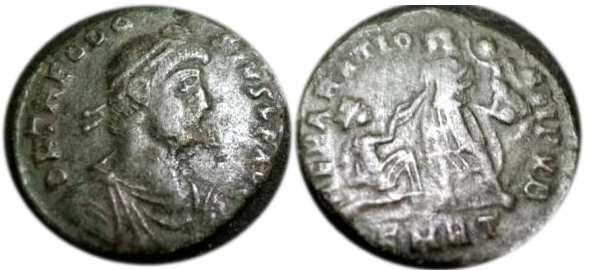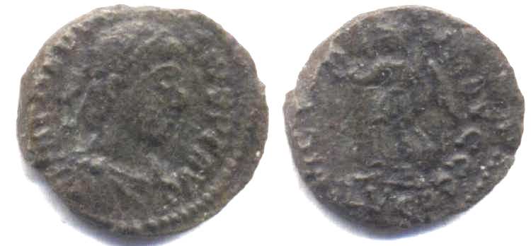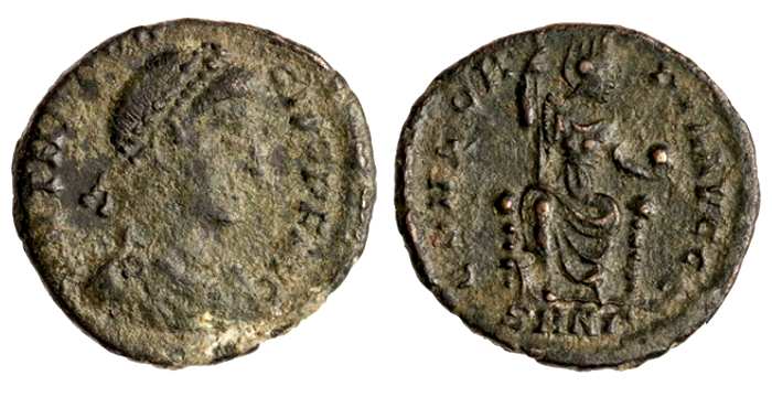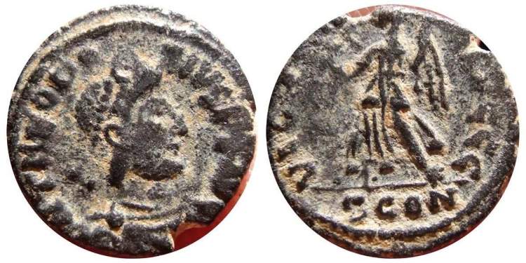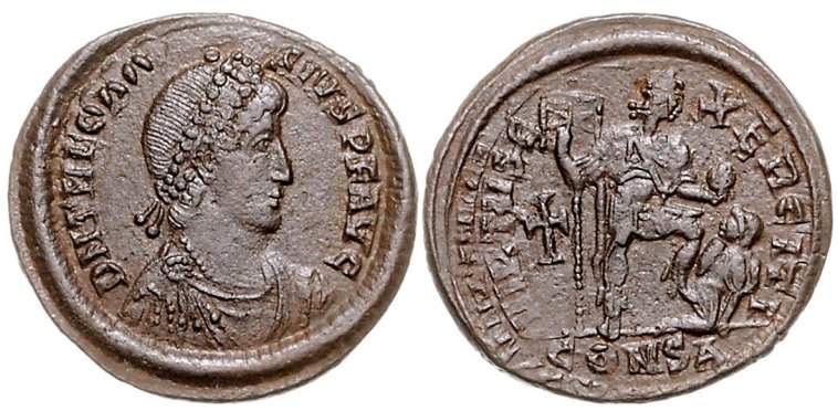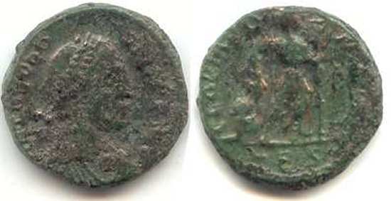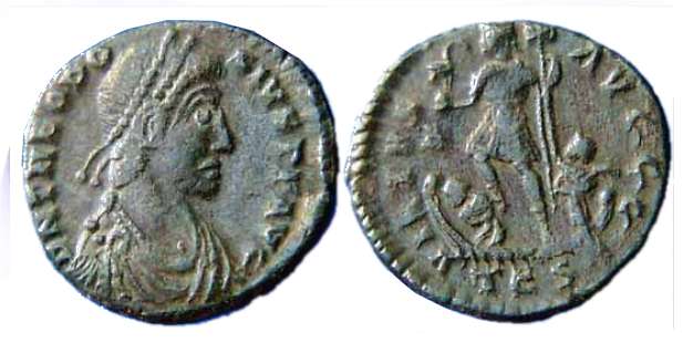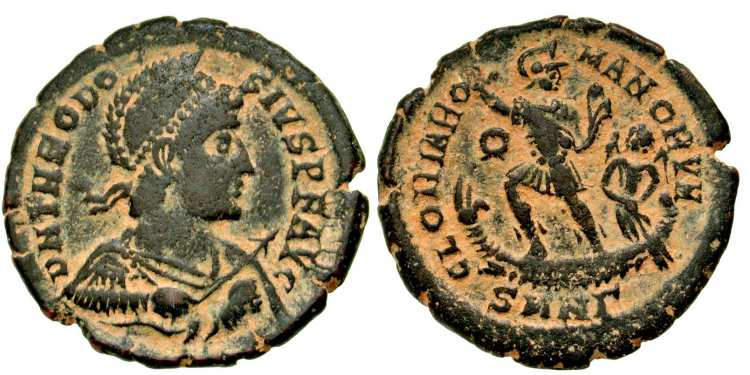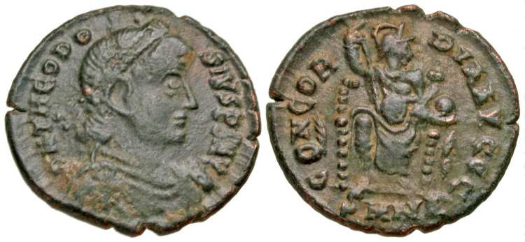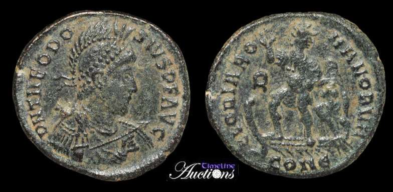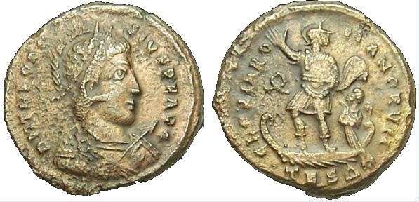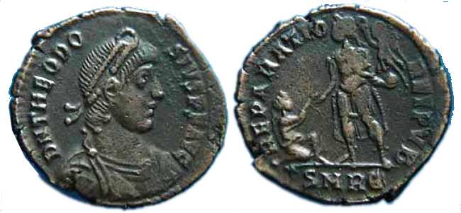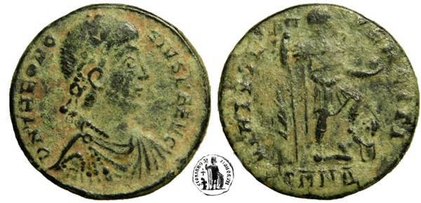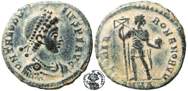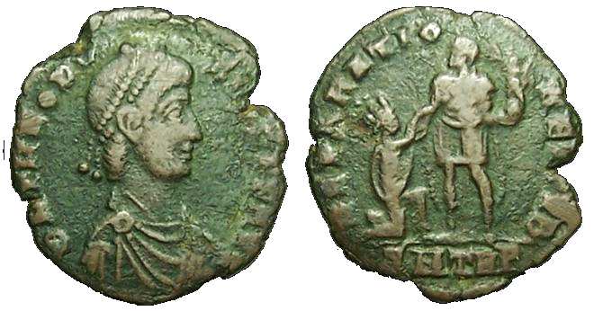 | Thessalonica RIC 61b | Theodosius I AE4. DN THEODOSIVS PF AVG, pearl-diademed, draped and cuirassed bust right / VIRTVS AVGGG, emperor standing left on prow of ship, head right, foot on captive and holding phoenix on globe and standard; Victory sits at the helm, A to left. Mintmark TES. | Text | Image |