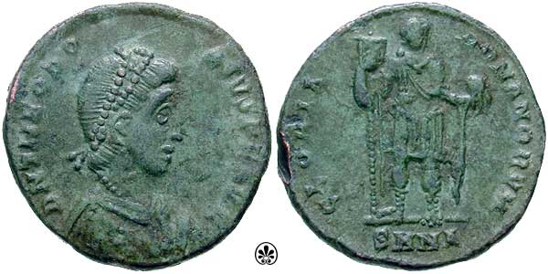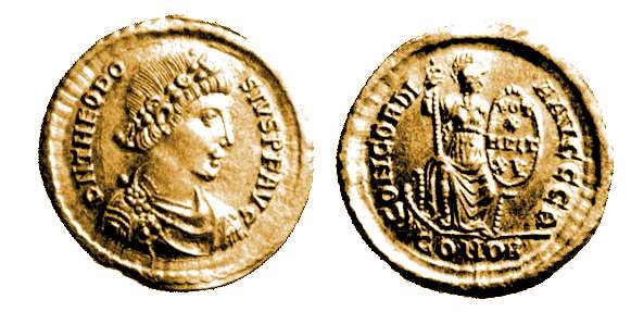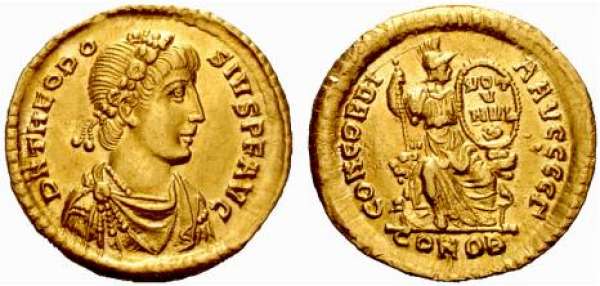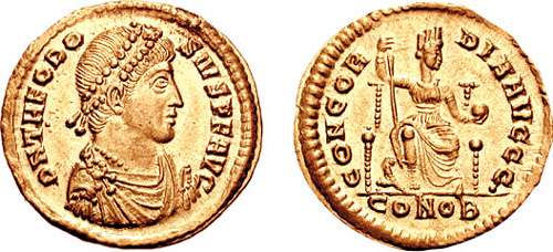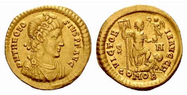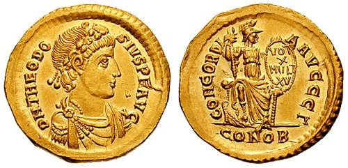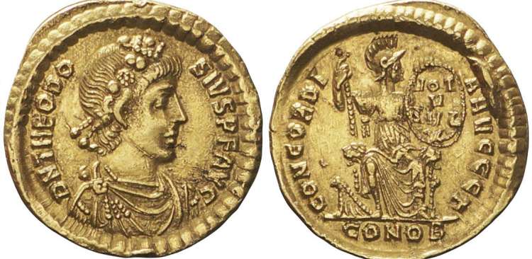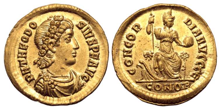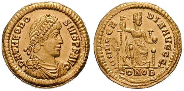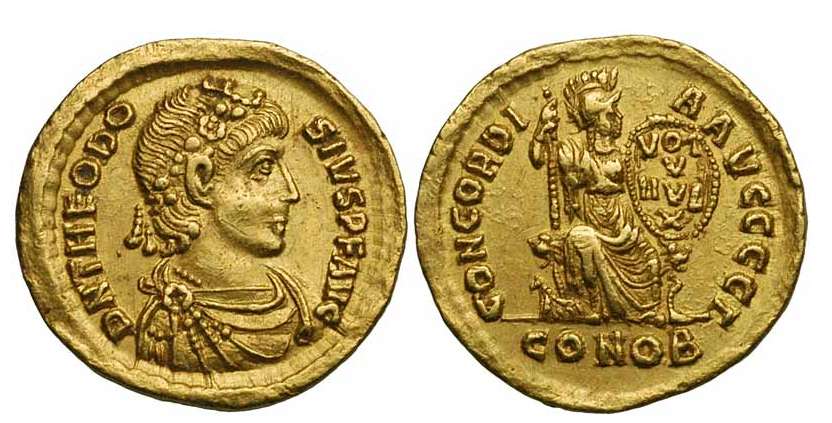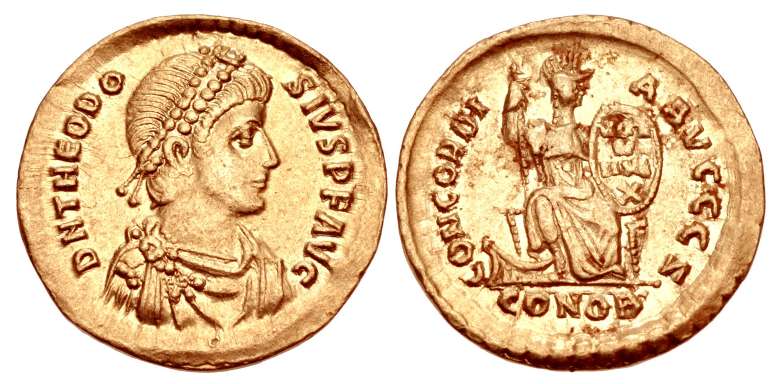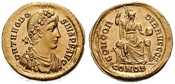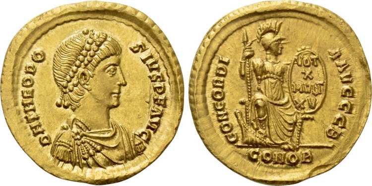 | Constantinople RIC IX 43b | Theodosius I AV Solidus. Struck 380 AD, Constantinople mint. DN THEODO-SIVS PF AVG, pearl-diademed, draped and cuirassed bust right / CONCOR-DIA AVGGG., Constantinopolis enthroned, head right, right foot on prow, holding sceptre and globe. Mintmark CONOB. | Text | Image |