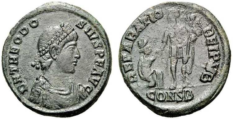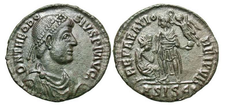 | Siscia RIC IX 26c type 3 | Theodosius I AE2. DN THEODO-SIVS PF AVG, pearl-diademed, draped and cuirassed bust right / REPARATIO REIPVB, Theodosius standing front, head left, holding Victory on globe and raising kneeling woman. Mintmark ASISC dot. RIC IX 26c type 3. | Text | Image |