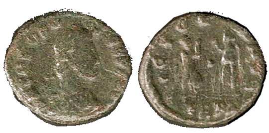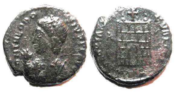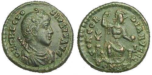 | Constantinople RIC 57d, B | Theodosius I AE3. 379-383 AD. DN THEODOSIVS PF AVG, pearl-diademed, draped and cuirassed bust right / CONCOR-DIA AVGGG, Constantinopolis seated front, looking left, holding globe and sceptre. O in left field. Mintmark CONSA. RIC IX Constantinople 57d; Cohen 5. | Text | Image |