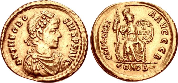 | Constantinople RIC IX 44b1 | Theodosius I AV Solidus. Constantinople mint, 383 AD. DN THEODOSIVS PF AVG, pearl-diademed, draped, and cuirassed bust right / CONCORDIA AVGGGΔ, Constantinopolis, helmeted, seated facing, head right, right foot on prow, holding sceptre in left hand, shield inscribed VOT-V-MVL-X in four lines in right. Mintmark CONOB. Depeyrot 38/1. | Text | Image |