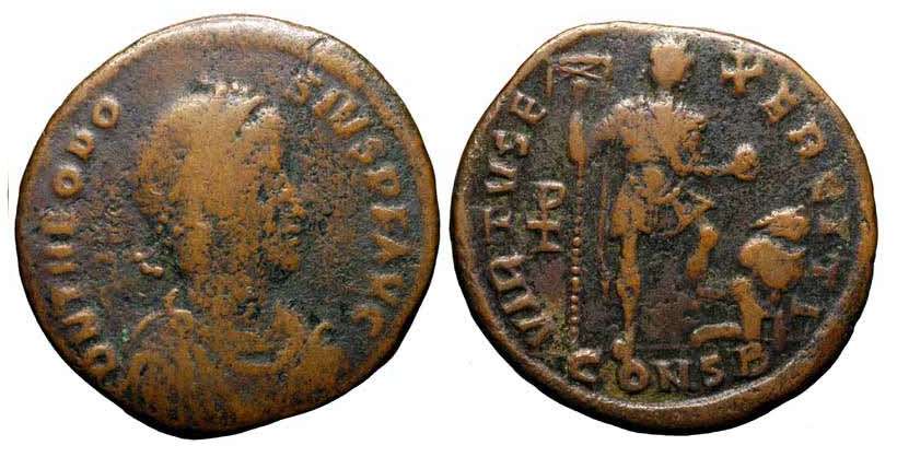 | Constantinople RIC IX 83b, B | Theodosius I AE2. 383-388 AD. DN THEODOSIVS PF AVG, pearl-diademed, draped and cuirassed bust right / VIRTVS EXERCITI, Emperor stepping to the right, treading on captive and holding labarum and globe. P-headed cross in left field. Mintmark CONSB. RIC IX Constantinople 83b var (field mark and officina); Sear 20504 var (ditto). | Text | Image |