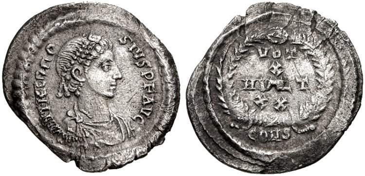 | Constantinople RIC 51b | Theodosius I AR Siliqua. 379-383 AD. DN THEODO-SIVS PF AVG, pearl-diademed, draped and cuirassed bust right / VOT V MVLT X within wreath. Mintmark CONS dot. RSC 64. | Text | Image |