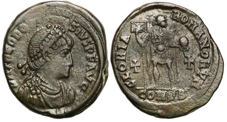 | Constantinople RIC IX 83b, A | Theodosius I AE2. 383-388 AD. DN THEODOSIVS PF AVG, pearl-diademed, draped and cuirassed bust right / VIRTVS EXERCITI, Emperor stepping to the right, treading on captive and holding labarum and globe. Cross in left field. Mintmark CONSA. RIC IX Constantinople 83b; Sear 20504. | Text | Image |