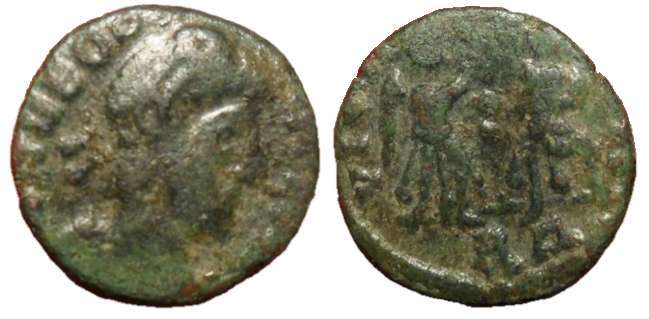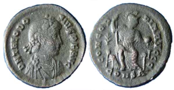 | Lyons RIC IX 44c | Theodosius I, AE4 of Lyons. THEODO-SIVS PF AVG, pearl-diademed, draped and cuirassed bust right / VICTOR-IA AVGGG, Victory walking left, holding wreath and palm branch. Mintmark LVGP. RIC IX Lyons 44c. | Text | Image |