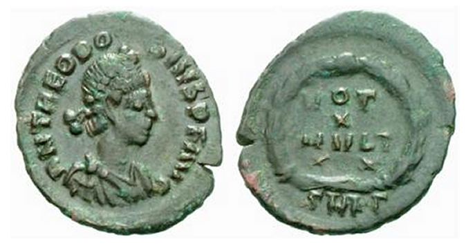 | Thessalonica RIC IX 49b | Theodosius I, AE4, Thessalonica. DN THEODO-SIVS PF AVG, pearl-diademed, draped and cuirassed bust right. / VOT X MVLT XX in four lines within wreath. Mintmark TESB. RIC IX Thessalonica 49b; ANS 1944.100.25613. | Text | Image |